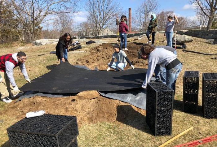 Students from Grasso Tech digging the tiers of the falls along with their teacher, Larry Fritch